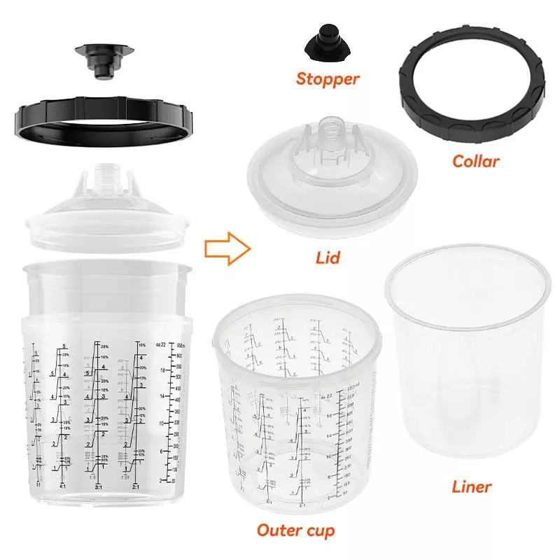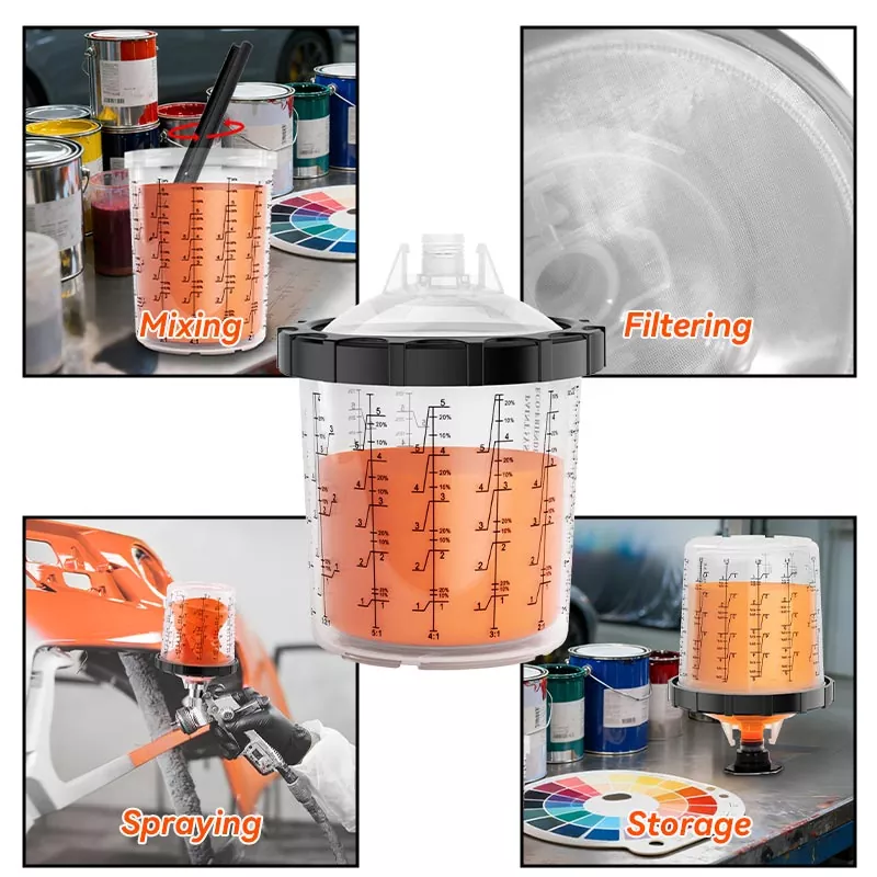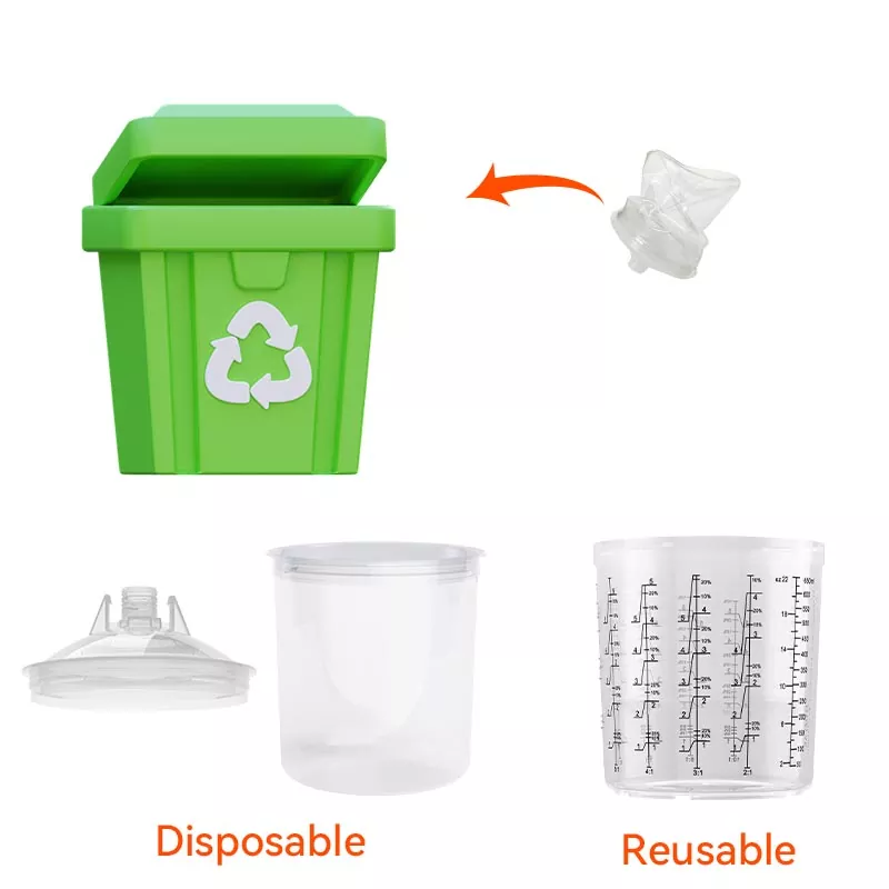 Birdəfəlik boya fincan sistemi qarışdırma, filtrləmə, çiləmə və saxlama funksiyalarını bir vahiddə birləşdirir. Bu, nəinki boyadan əvvəl hazırlığı asanlaşdırır, həm də stəkanları və kağız huniləri qarışdırmaq xərclərinə qənaət edir, bu da onları hazırlıq vaxtına qənaət etmək və çiləmə səmərəliliyini artırmaq üçün mükəmməl seçim edir.
