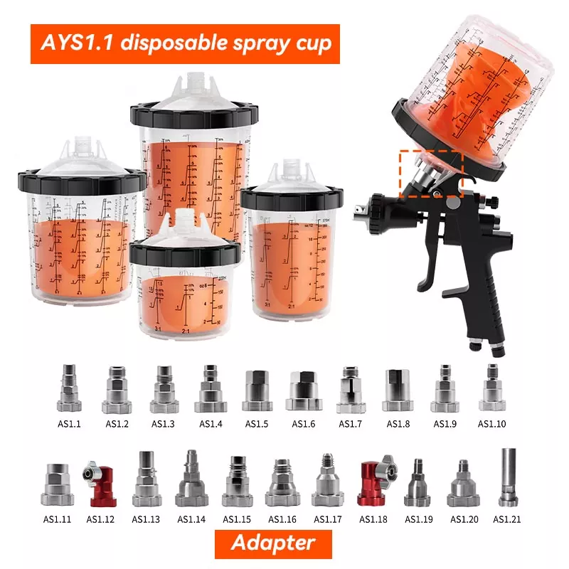 AYS1.1 birdəfəlik sprey fincanı PPS1.0 seriyalı adapterlə uyğun gəlir. Adapterlə istənilən marka sprey tabancasına mükəmməl uyğunlaşdırıla bilər və boya damlama riski olmadan istənilən vəziyyətdə istifadə edilə bilər.