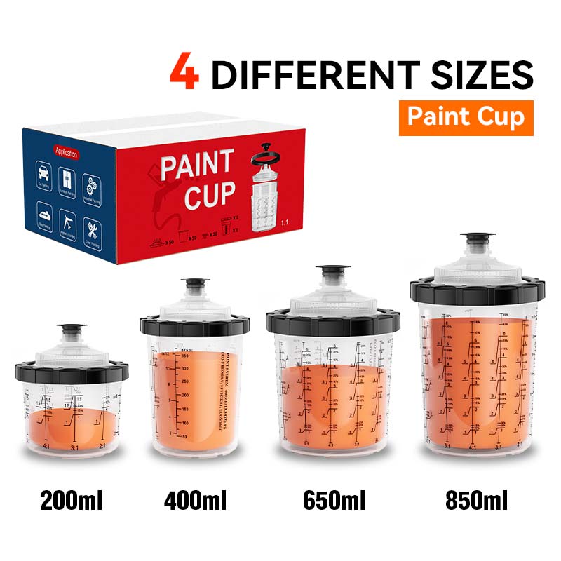 Bazar araşdırmasına əsaslanaraq, boya kuboku dörd tutumlu spesifikasiyalarda mövcuddur: 200ml, 400ml, 650ml, 850ml və 850ml, geniş ərazilər üçün püskürtmə və ya ətraflı toxunuşlar üçün müxtəlif istifadə ssenarilərinə iaşə. Bundan əlavə, daxili kubokun quruluşu hamar boya axınını təmin etmək, tıxanma və tullantıların azaldılması üçün optimallaşdırılmışdır.